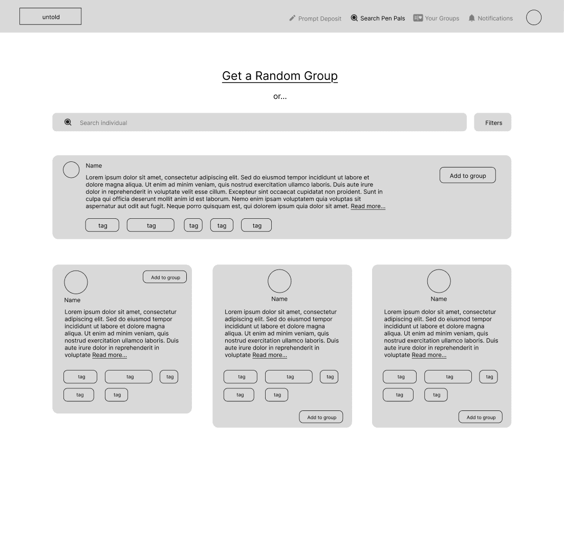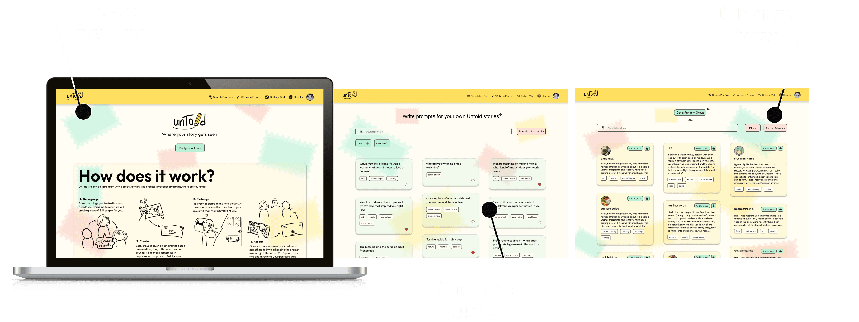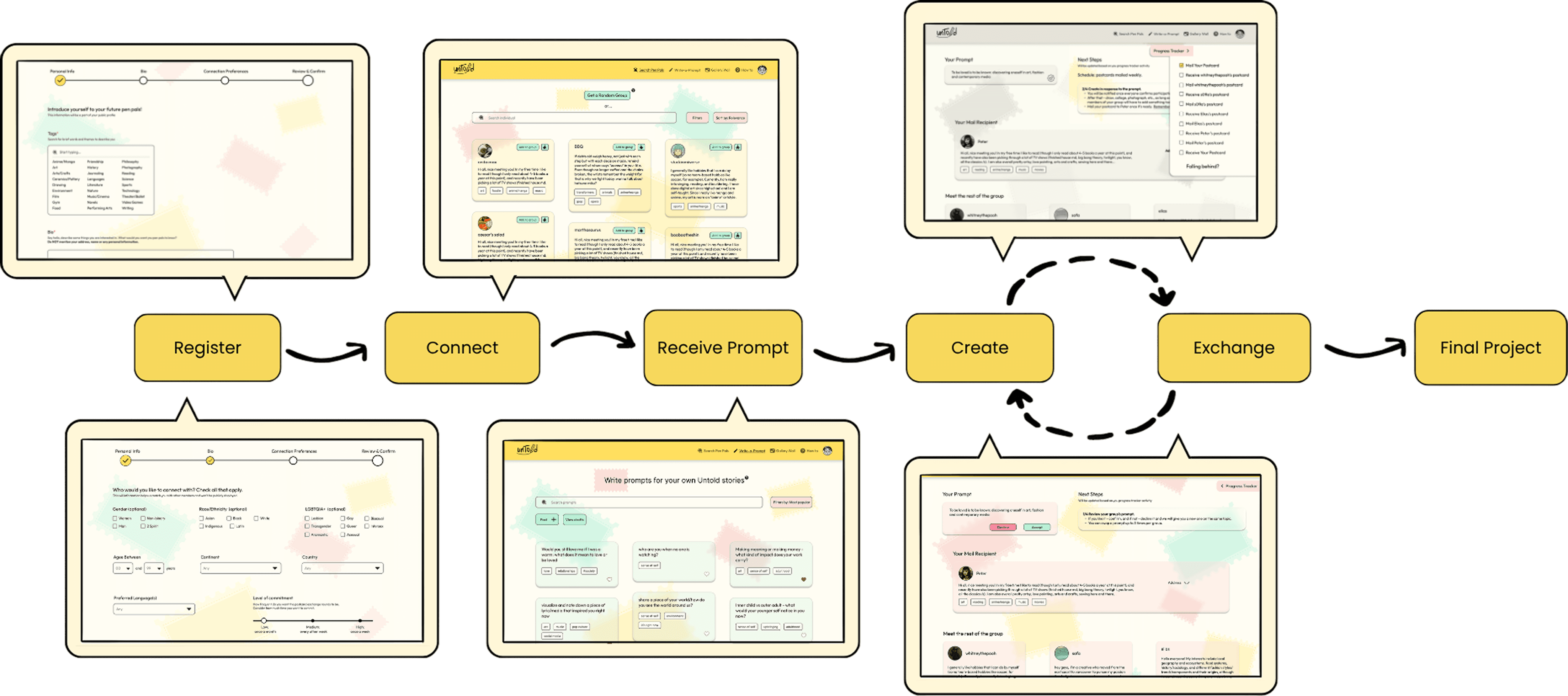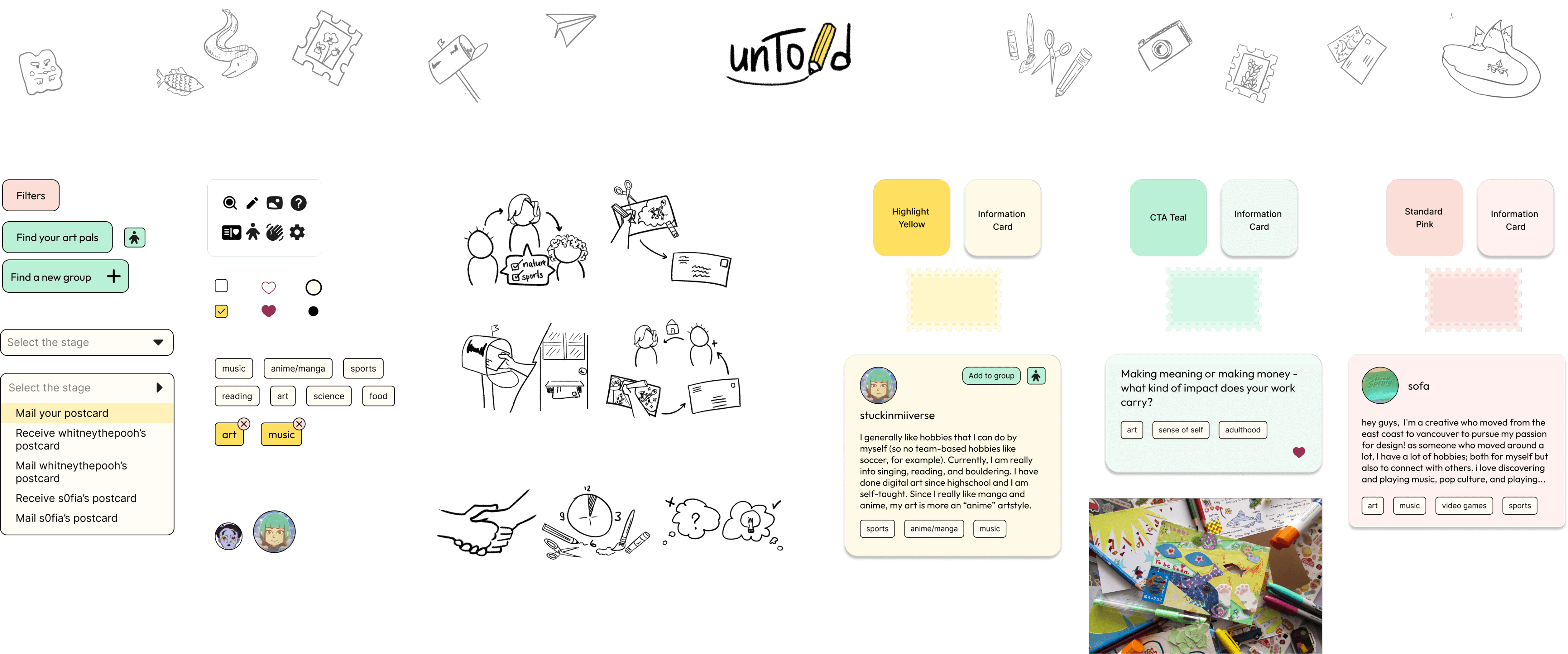 Based on the insights discovered through the layering of discovery research and iterative user testing sessions, unTold became a comprehensive art pals system, that aims to bring communities together for the creative and collaborative exchange of their untold stories.
