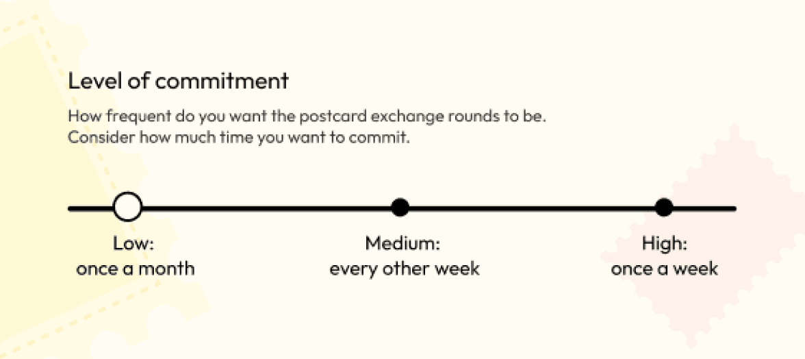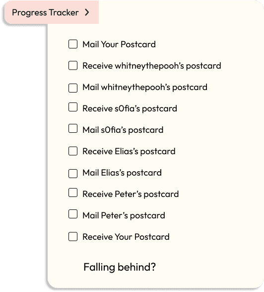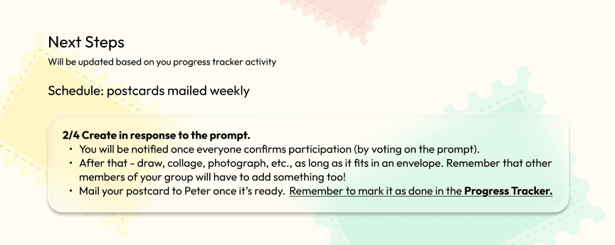 Users will be given tools and support to take their art exchange offline, such as guided group lists with participant bios for the initial introduction, progress tracking and step-by-step guidance.