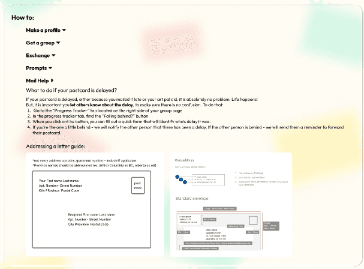 To further continue refining the platform, I ran 2 separate research sessions - one being a remote, mail-based art exchange, and the other an in-person group workshop.