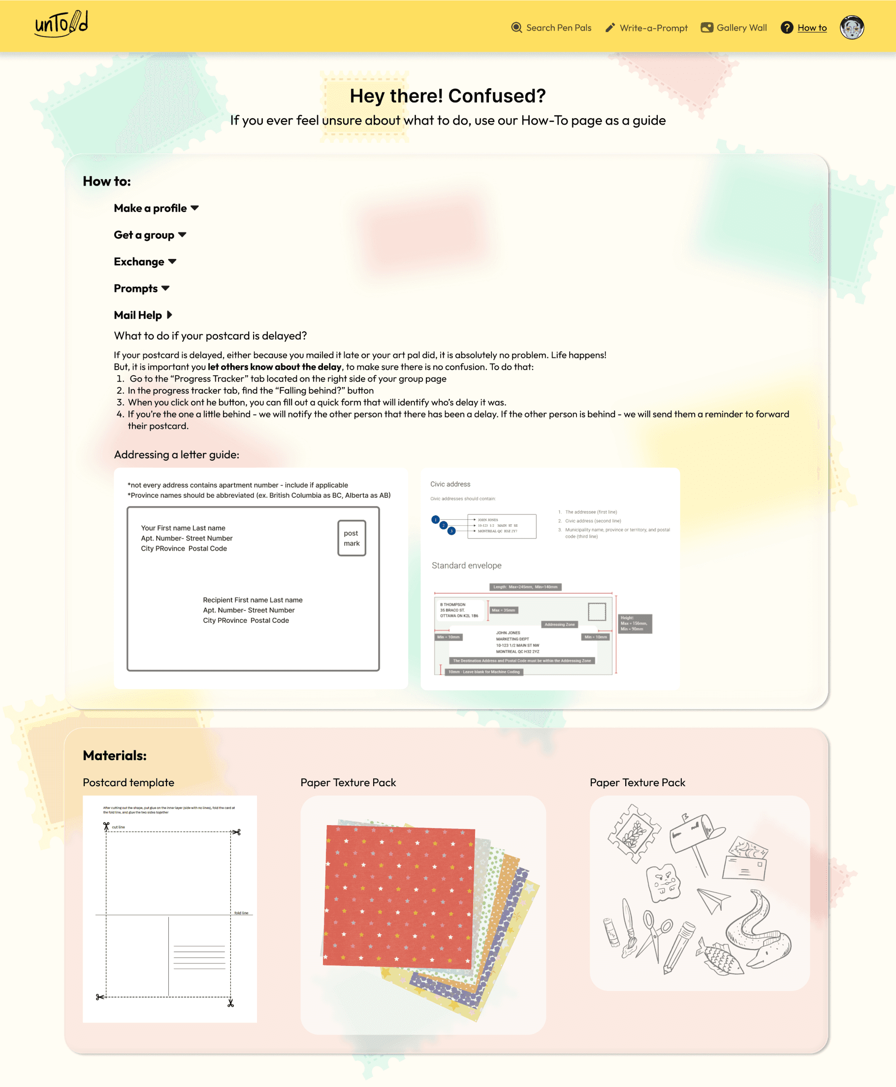 The page includes support materials, such as mailing templates and postcard addressing guides.